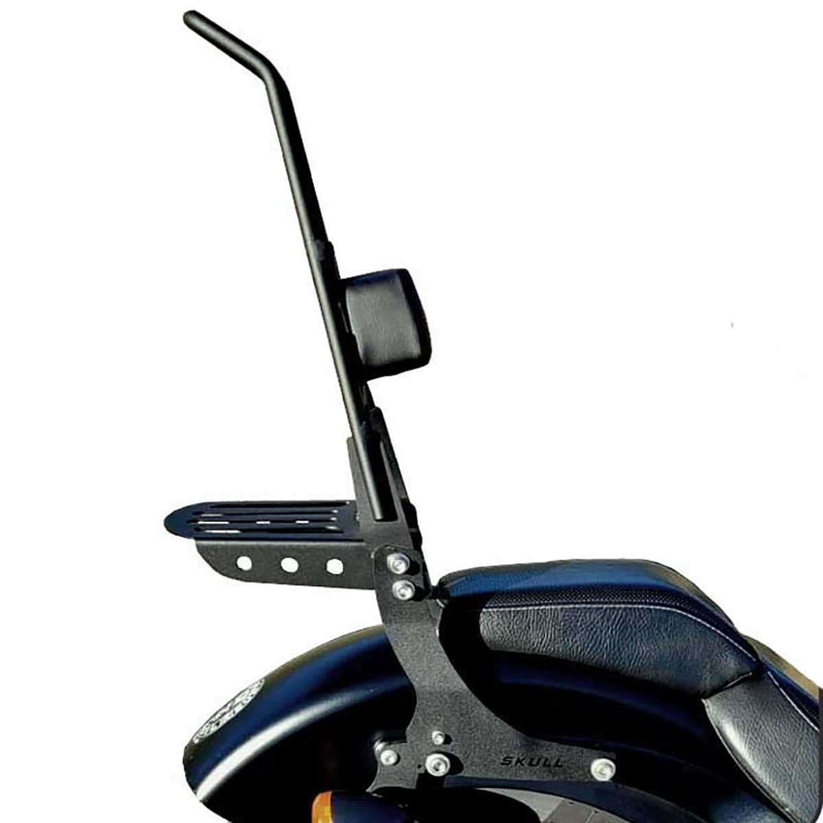 Os Sissy Bars Destacáveis Altos da Skull Custom têm design exclusivo e contam com as melhores técnicas de fabricação e materiais de máxima qualidade: barras redondas maciças de aço carbono com 16 mm e chapas de aço carbono especial com 3 mm de espessura, proporcionando durabilidade e segurança.