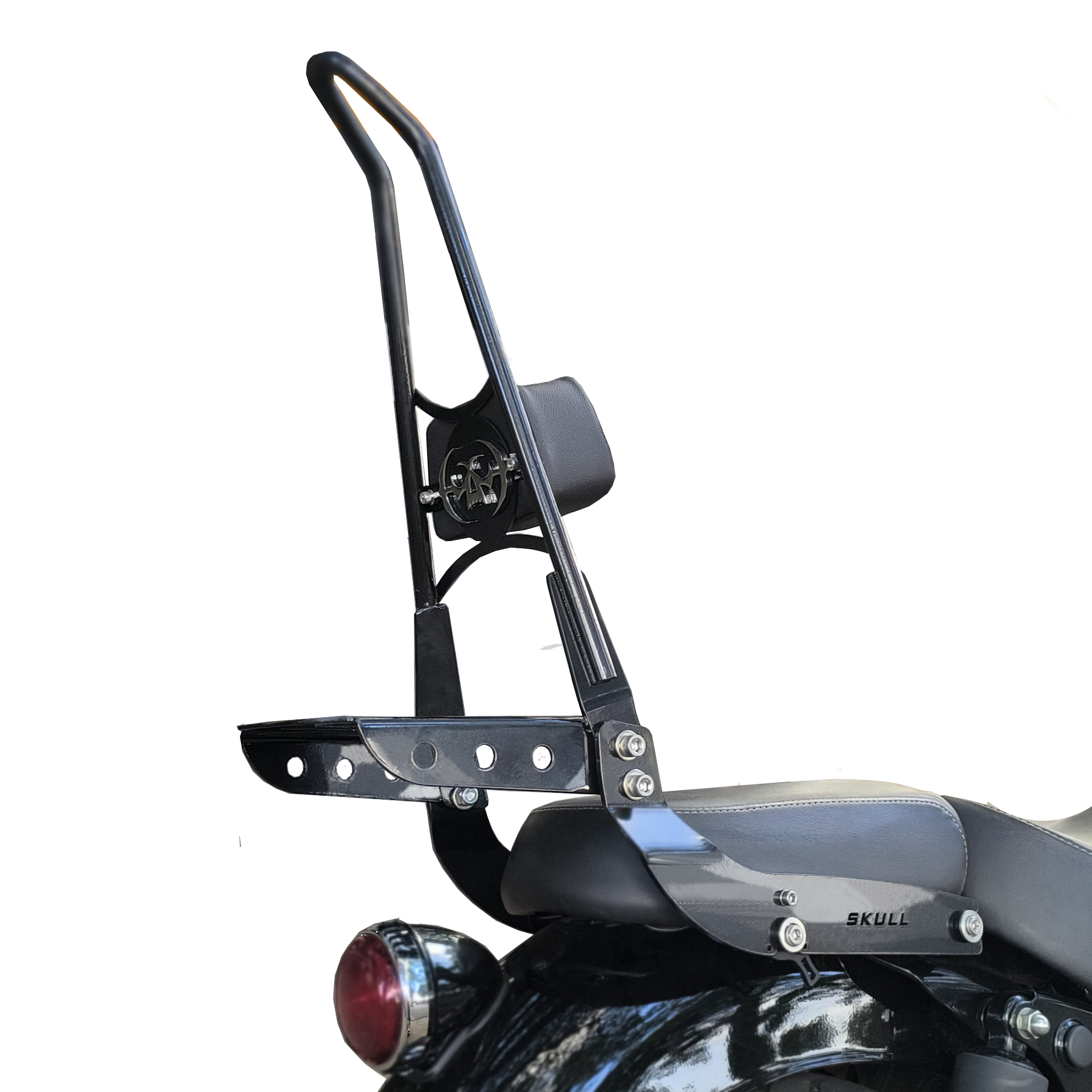 Os Sissy Bars Destacáveis Altos da Skull Custom têm design exclusivo e contam com as melhores técnicas de fabricação e materiais de máxima qualidade: barras redondas maciças de aço carbono com 16 mm e chapas de aço carbono especial com 3 mm de espessura, proporcionando durabilidade e segurança.